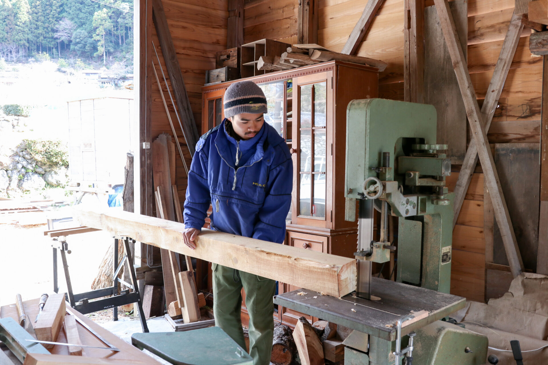 製材や建築・木工をしています。移住してから縁があって、丸太をカットできる大きな製材機を譲り受けました。それを集落内の少し離れた場所に設置していて、地域に生えている木を角材や板材に加工しています。