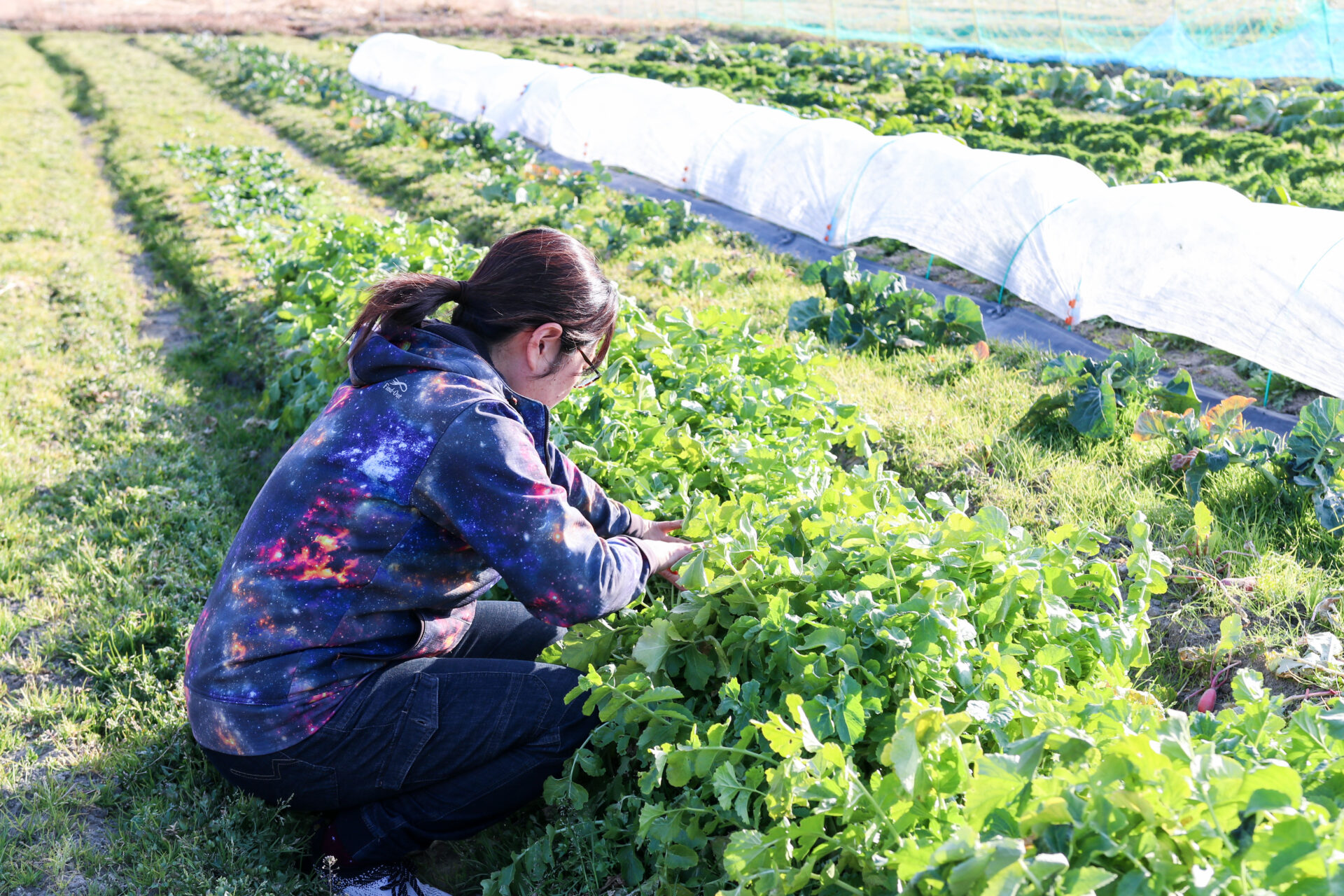 季節によって全然違って、冬場は結構ゆっくりです。朝は野菜が凍ってカチカチになっているので、溶け始める10時くらいから収穫に入ります。それから袋詰めをしてAコープへ出荷に行き、戻ってから次の作物の準備や土を耕したりします。冬は日が短いので、午後4時くらいには作業を終えて家に戻ります。